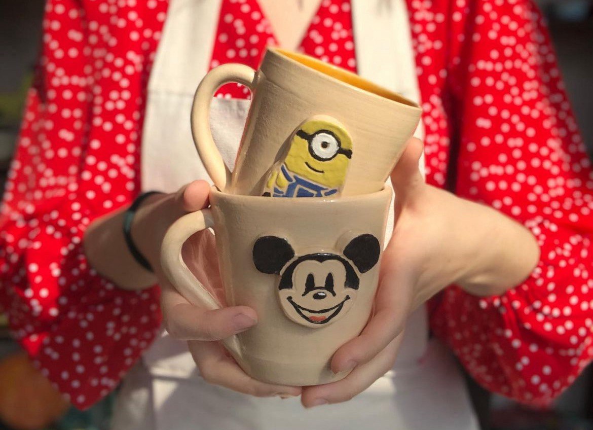 Ручку и героя делаем вручную. Ручки тоже бывают разной формы, и вы выбираете, какая больше понравится. Персонажа мы делаем с помощью штампа. Кстати, у каждого героя есть свой артефакт - это маленький предмет, связанный с его историей. Например у Винни Пуха горшочек с медом, у миньонов - их любимые бананы, а у Гарри Поттера - золотой снитч. Когда кружка собрана, нужно доработать персонажа - раскрашиваем его сами, на мастер-классе!