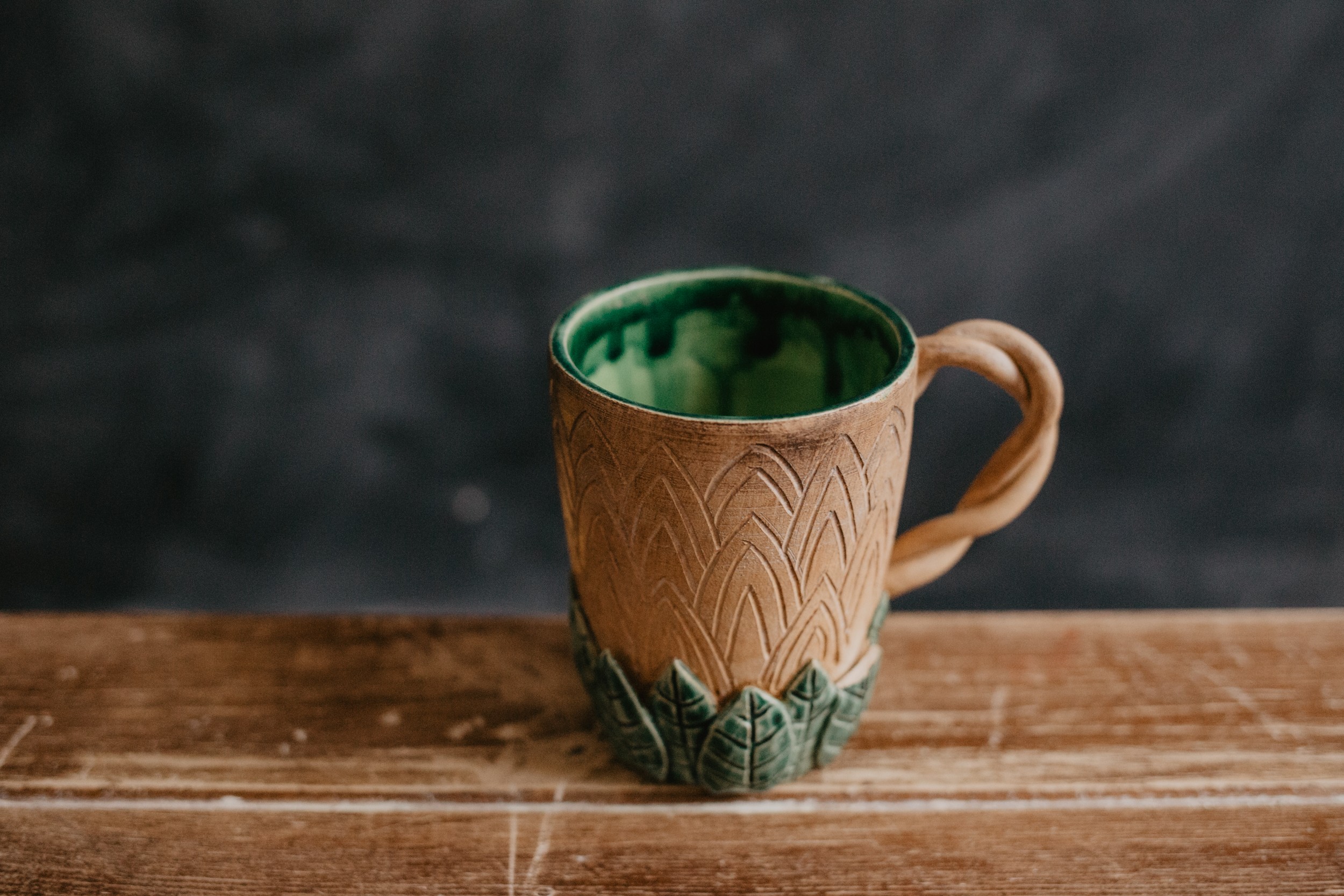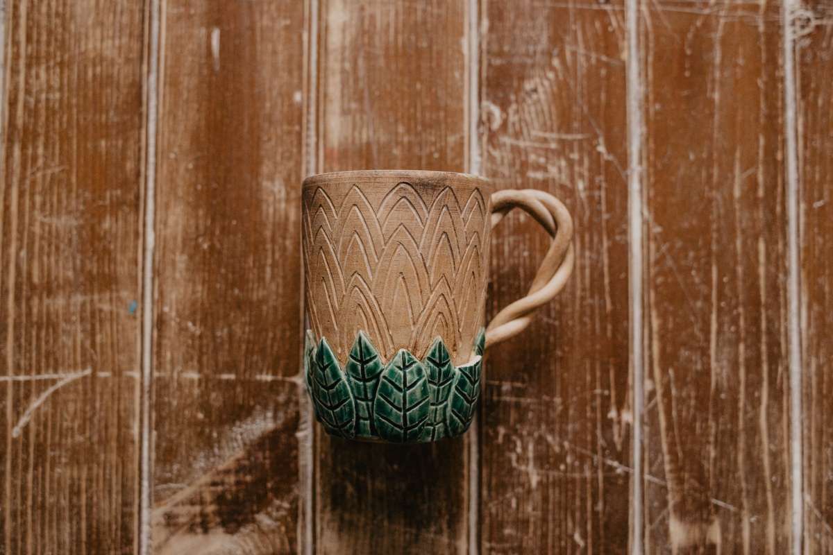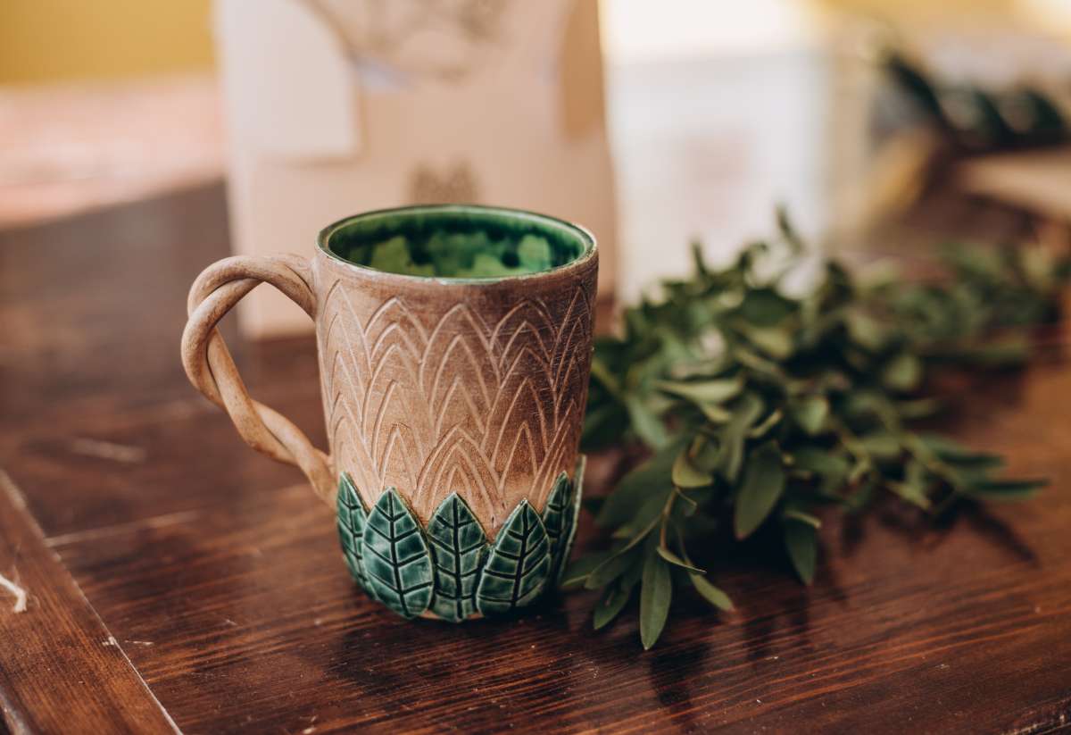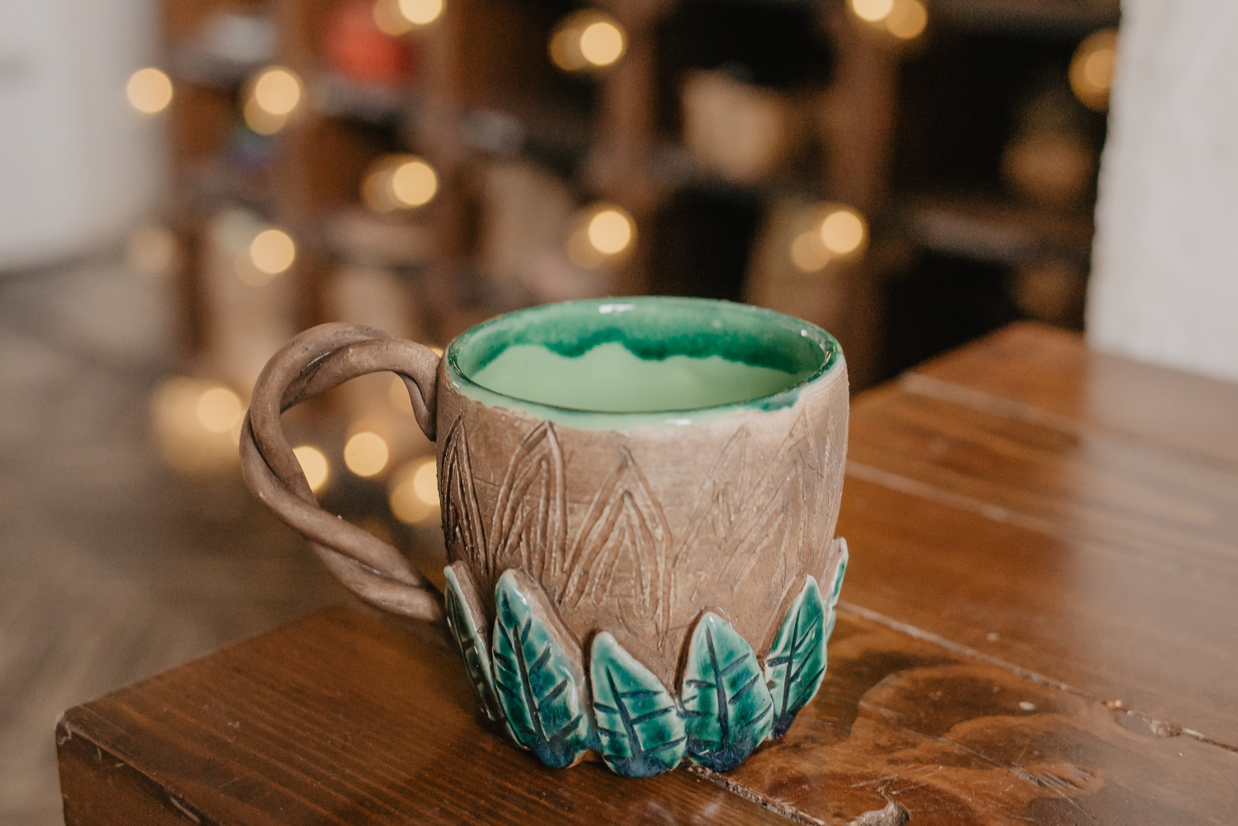 Кружка с древесным узором в сочетании с налепленными листочками, покрытыми насыщенными зелёными глазурями. Кружка создаёт ощущение сказочности и загадочности. Очень необычно смотрится в сочетании с Эльфийским салатником.
